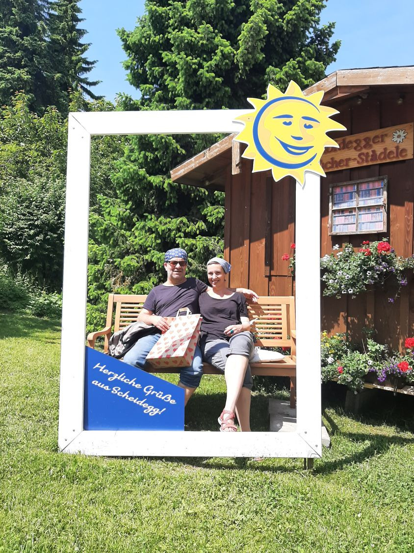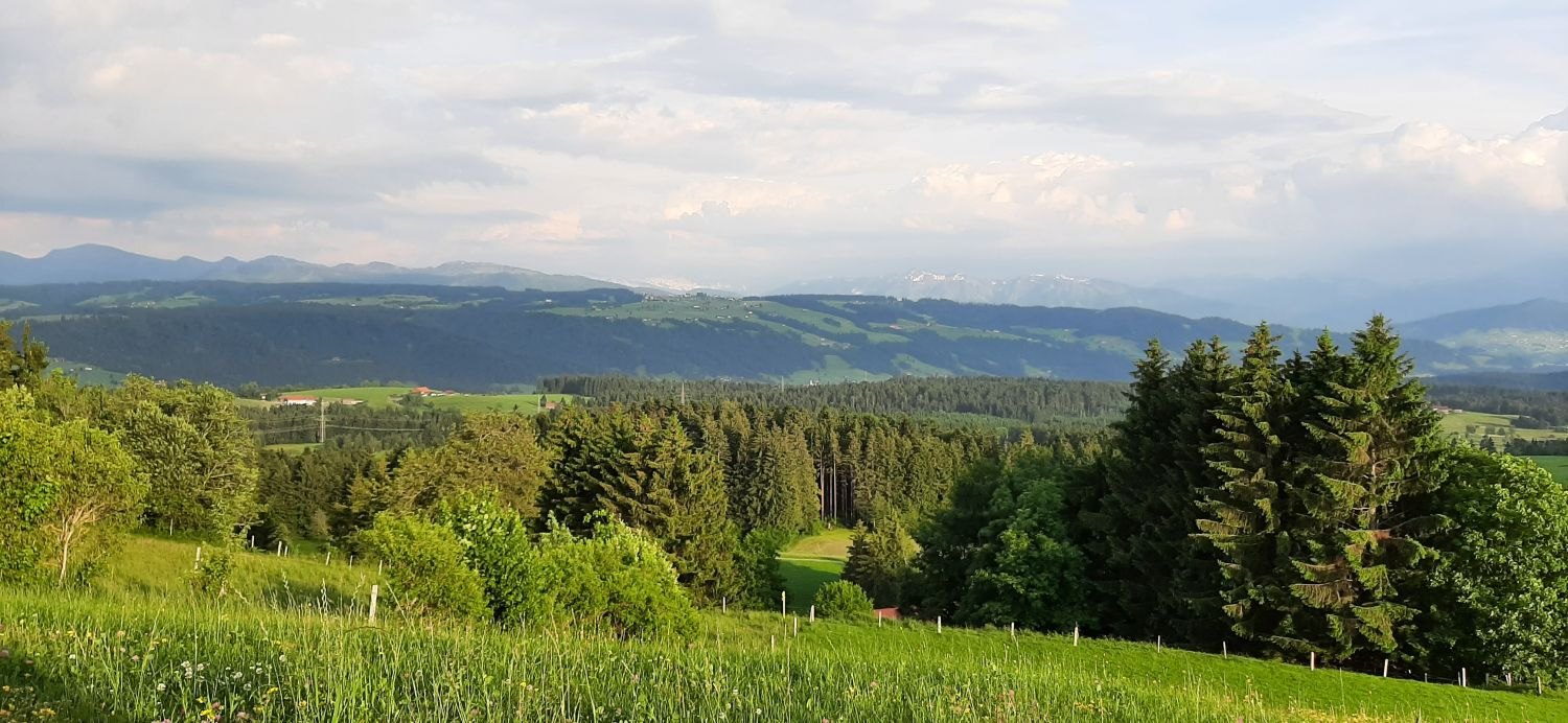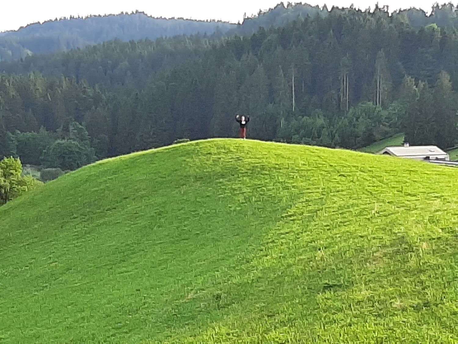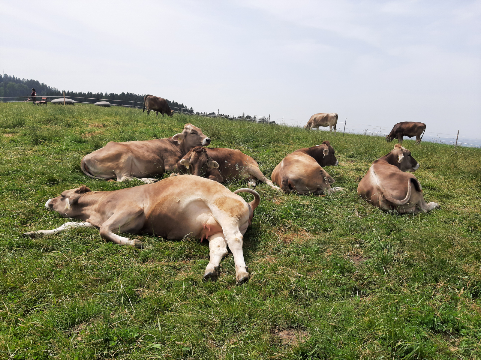 Wider Erwarten gelangen wir wohlbehalten in die Zivilisation zurück, gehen idyllisch essen und drehen noch eine Runde auf dem Höhenweg. Wir bewundern die schönen Schnallgäuer Kühe sowie die Aussicht auf Bodensee und Alpen, die nach dem Essen wieder entspannte Lotti kugelt übermütig einen Hügel hinunter, Chéri studiert die topografische Karte und doziert ein bisschen, eine vorbeiflanierende Touristin macht Fotos von uns dreien, und ruckzuck ist dieser ganze wunderbrare Besuchstag auch schon wieder vorbei. Als die beiden ins Auto steigen, bekomme ich einen furchtbar dicken Kloß im Hals und schreckliches Heimweh und erwäge, mich kurzerhand in den Kofferraum zu werfen. Stattdessen krieche ich in mein Schneckenhauszimmerchen zurück und versuche, mich über die doch so lange ersehnte Stille zu freuen. Alles nicht so einfach.