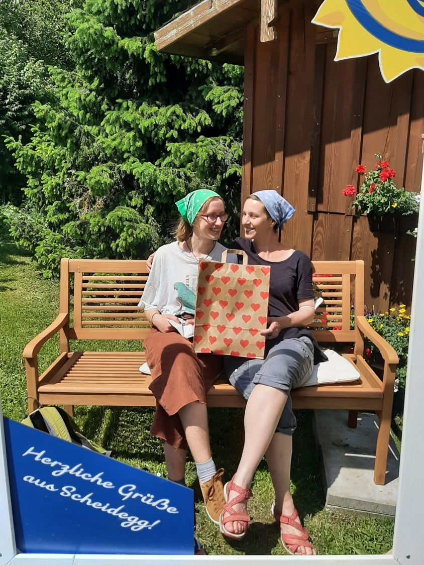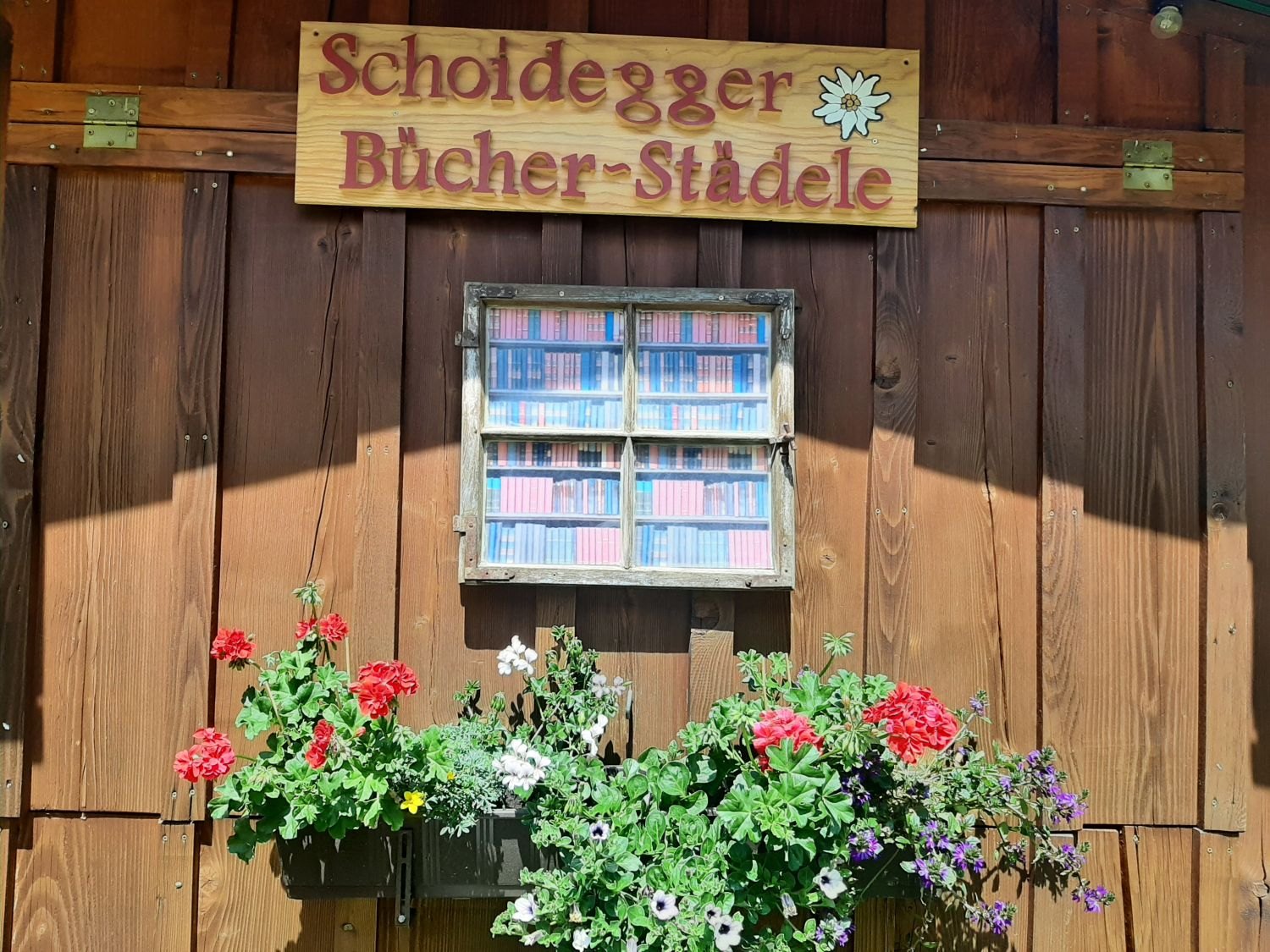 Nach der stürmischen Begrüßung bummeln wir zunächst durch Schneckeck City, entern eine Boutique, die ich ohne Lotti im Leben nicht betreten hätte, und kaufen mir ein zartes Feenkleidchen sowie ein zauberhaftes Flatterärmelblüschen. Wenn mein Körper schon keine Östrogene mehr produzieren darf, möchte ich ihn wenigstens mit ein paar femininen Wallawalla-Fummeln und glamourösen Deko-Elementen aufhübschen. Danach wackeln wir zum Schneckecker Bücherstädele – einem begehbaren Bücherschrank, dem man gegen eine Spende großartige alte Schinken entnehmen kann – und machen im überlebensgroßen Bilderrahmen hinreißende Tourifotos. Lotti sucht sich einen Bildband übers Tanzen aus, wir überreden sie jedoch, ihn erst später mitzunehmen, da sie ihn ja nicht die ganze Zeit mitschleppen möchte und ausgerechnet diesen einen speziellen Bildband sicher niemand in der Stunde mitnimmt, in der wir unterwegs sind.