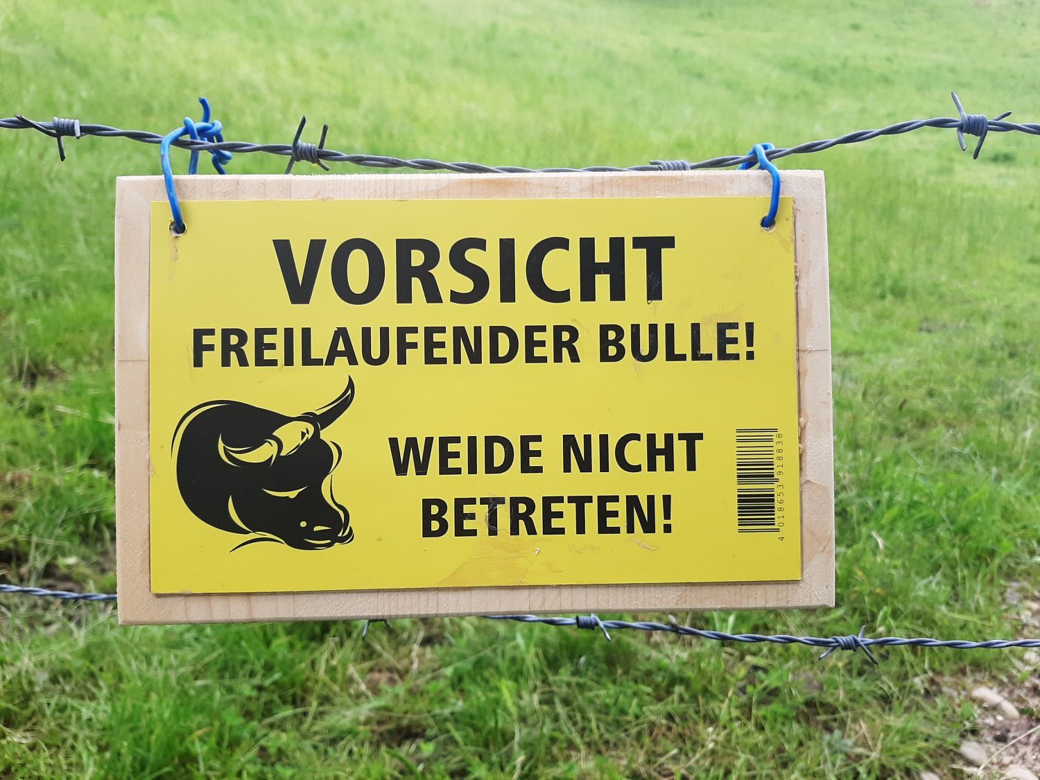 Es stellt sich heraus, dass der kürzeste Weg zurück nach Schneckeck direkt über eine Bullenweide führt. Zwar ist weit und breit kein Bulle zu sehen, aber ein Schild am Zaun warnt ausdrücklich: VORSICHT FREILAUFENDER BULLE! WEIDE NICHT BETRETEN! Chéri und ich würden das Risiko auf uns nehmen, Lotti allerdings wird heute erstmals bockig und weigert sich, die Wiese zu queren. Der Bulle könnte sich immerhin irgendwo versteckt halten und uns auflauern; der Trip mit dem Serienkiller war offensichtlich zu viel für sie. Also halten wir kurz an und essen Kekse, Chéri orientiert uns, und Lotti möchte aus nicht mehr nachvollziehbaren Gründen Gedichte von Eugen Roth zitieren, was ihr – in Anlehnung an Walther von der Vogelweide – den Titel Lotti von der Bullenweide einbringt. Danach geht es weiter, hübsch um den hinterlistigen, unsichtbaren Bullen und seine Weide herum.