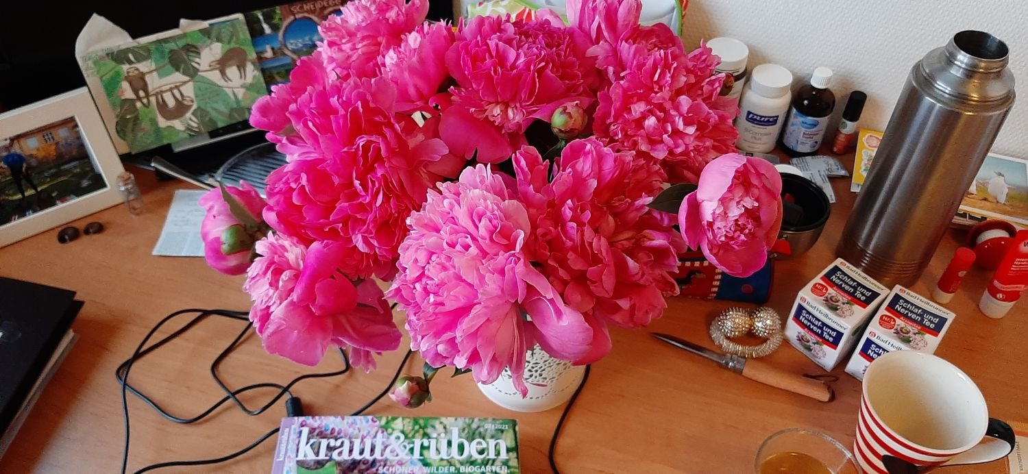 Am zweiten Wochenende meiner Anschlussheilbehandlung in Schneckeck bekomme ich Besuch von Chéri und Lotti, und ich freue mich riesig. Schon eine Stunde, bevor sie auf den von meinem Zimmer gut einsehbaren Parkplatz einbiegen könnten, klebe ich am Fenster und frage mich, wo sie nur bleiben. Als sie endlich anrollen, purzelt die grüngesichtige, weil reisekranke Lotti aus dem Auto und muss sich erst mal auf den Bordstein setzen, Chéri hingegen überreicht mir einen überdimensionalen Strauß Pfingstrosen, die er den Bienen in seinem Garten geklaut hat. Nachdem Lotti sich wieder gesammelt hat, knutsche ich sie stürmisch ab und bekomme im Gegenzug von ihr eine Tasche mit georderten Dingen, die mir für die kommenden Wochen im Exil unentbehrlich erscheinen: Pflaster, Schlaftee, einen Locher, meine Schneckenmuschelohrringe sowie das bezaubernde Armband von Frau Zorn.