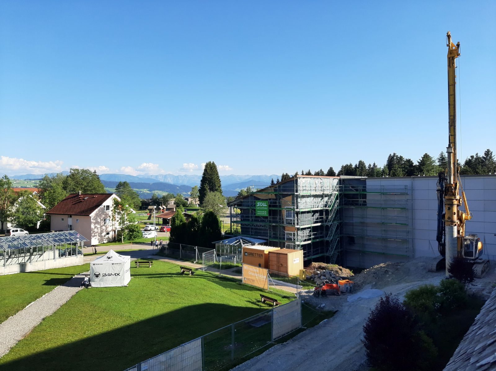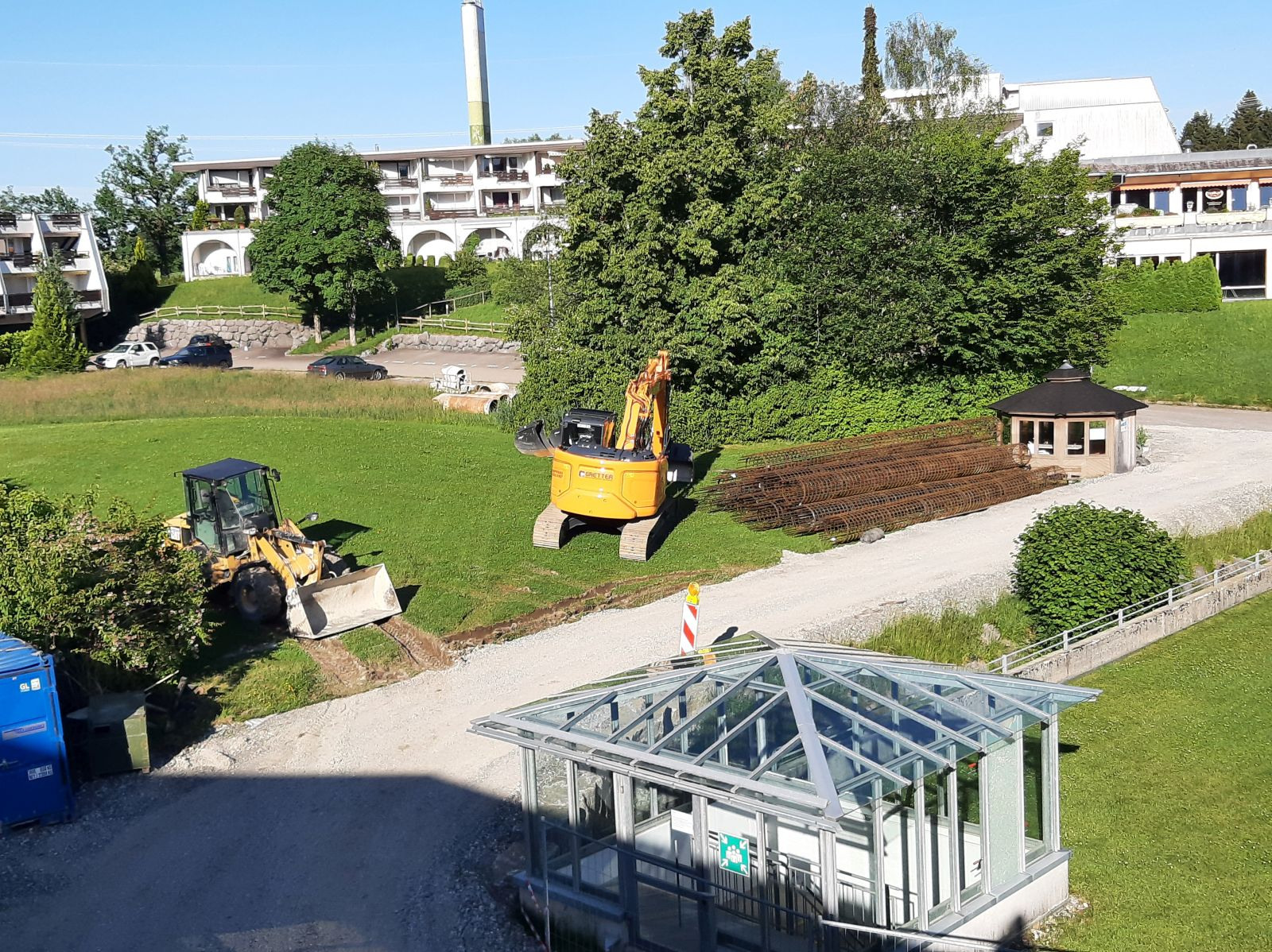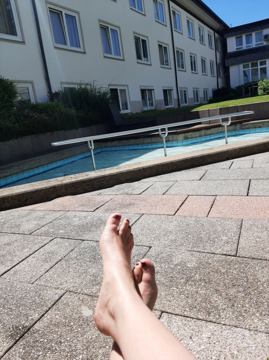Das Programm ähnelt sehr dem des Vorjahres, allerdings turne ich heuer in allen Disziplinen auf Level 3 (von 3). Gemeinsam mit meinen Onko-Kolleginnen mache ich Fitnessgymnastik zu Boney M. und ABBA, während Frau Fonda uns mit Geschichten aus ihrem Leben unterhält, ziehe im Beckenbodentraining imaginäre Gummibänder zwischen meinen Sitzbeinhöckern zusammen, entdecke das Gerätetraining für mich (PUMPEN!), schwebe beim Wasserballett durchs Therapiebecken und mache im Qi Gong wahlweise den Pfau, den Kranich, die Sonne oder den Baum. Zwischendurch genieße ich die segensreiche Stille in der neu eingerichteten Ruhezone auf dem Ballermann, der ansonsten recht kommunikativen Sonnenterrasse mit Alpenblick und Baustellenpanorama. Ein Träumchen. Einziger Wermutstropfen: Bei den Mahlzeiten vermisse ich schmerzlich Koala, meine verflossene Tischnachbarin.
