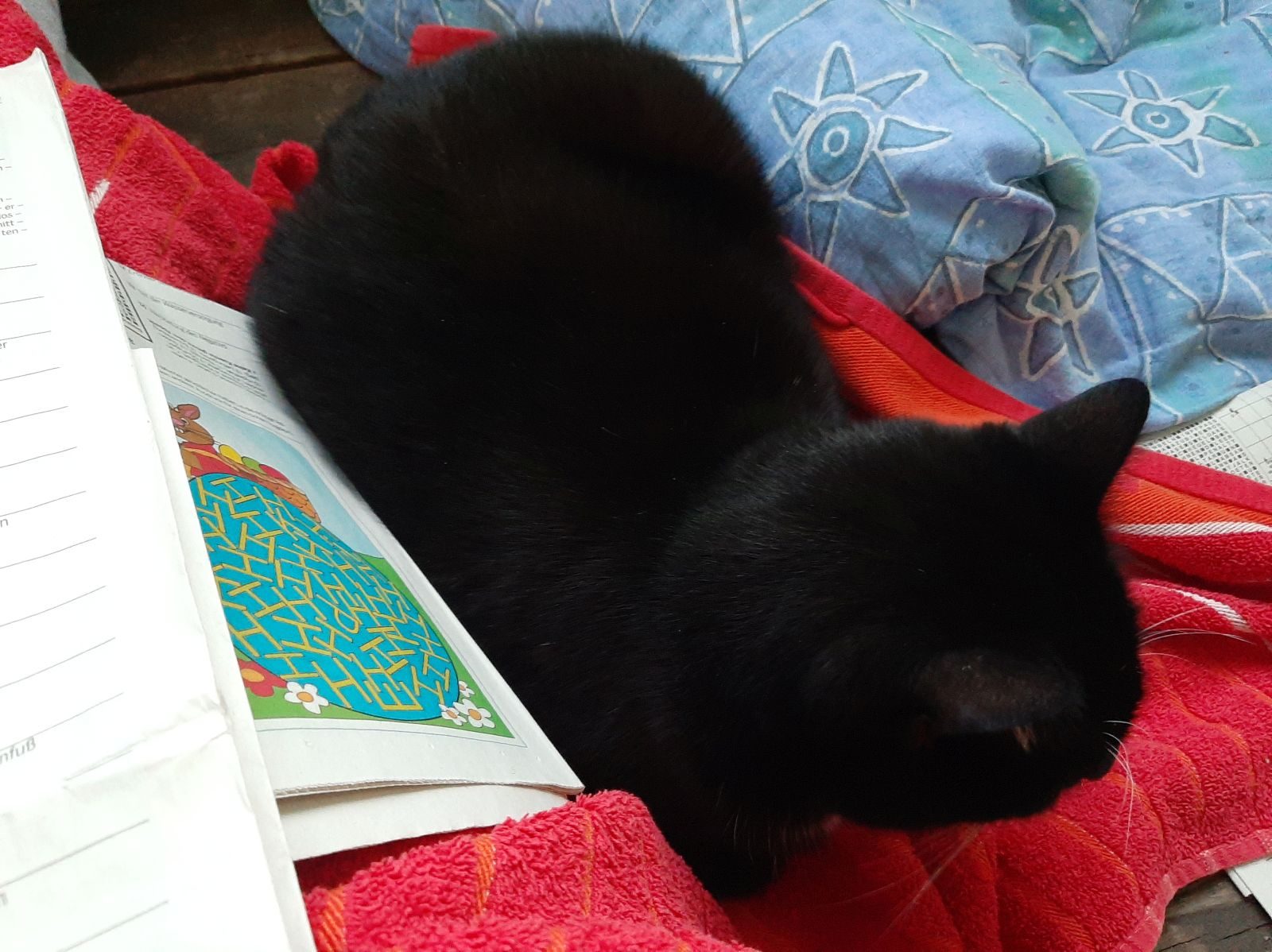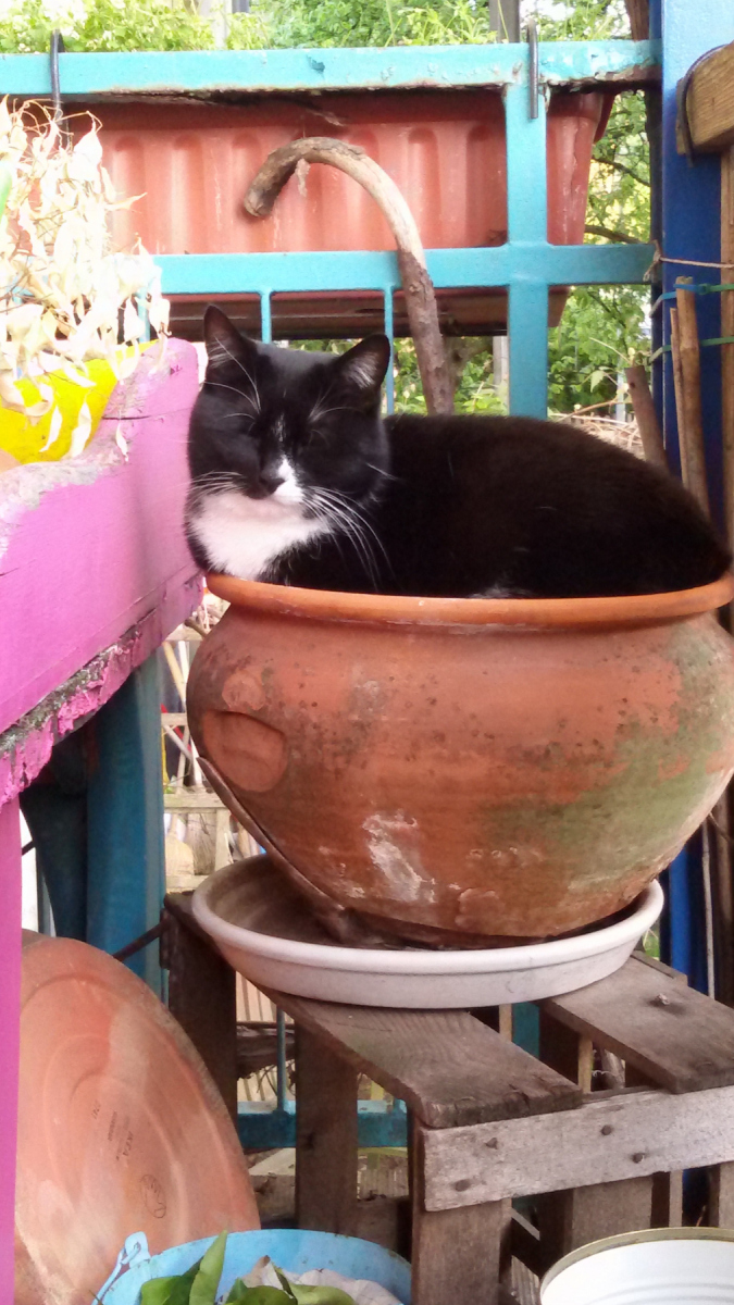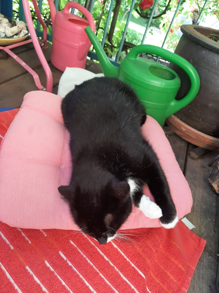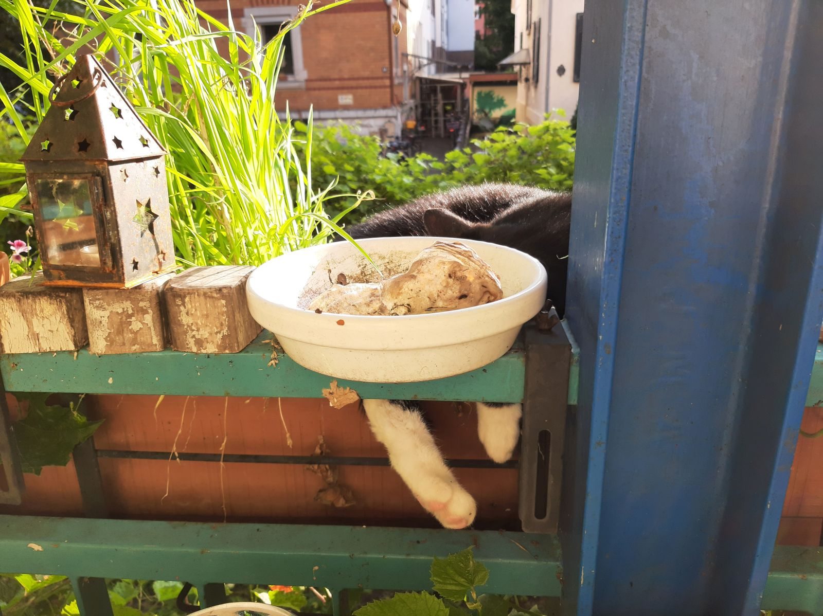 Nachdem ich mich insgesamt hinreichend aufgeregt habe, füge ich mich in das Unvermeidliche und mache – mal wieder – die Stoizismus-Nummer, es hilft ja nichts. Zum Glück ist gutes Wetter, und so ziehe ich mit Sack und Pack, Katzen, Kaffee und Zeitung auf unseren weinumrankten Balkon und richte mich für die kommenden Tage häuslich ein. Aus Gymnastikmatte, Decken und Kissen bereite ich mir ein Lager, löse 1001 Kreuzworträtsel, lese uralte Zeitungsartikel und schreibe brandneue Blogartikel. Durch die Gitterstäbe meines Balkons parliere ich mit den Nachbarinnen, sehe den Mauersegler*innen zu, wie sie kreischend durch die Häuserschluchten schießen, lausche ergriffen dem Hummelgebrummel in den Rosen sowie dem Abendgesang der Amsel auf Schnattarinas Haus gegenüber und chille mit den Katzen meine Base. Letztere lungern hocherfreut 24/7 mit mir herum, wahrscheinlich denken sie, dass ihr Mensch es nun endlich begriffen hat.