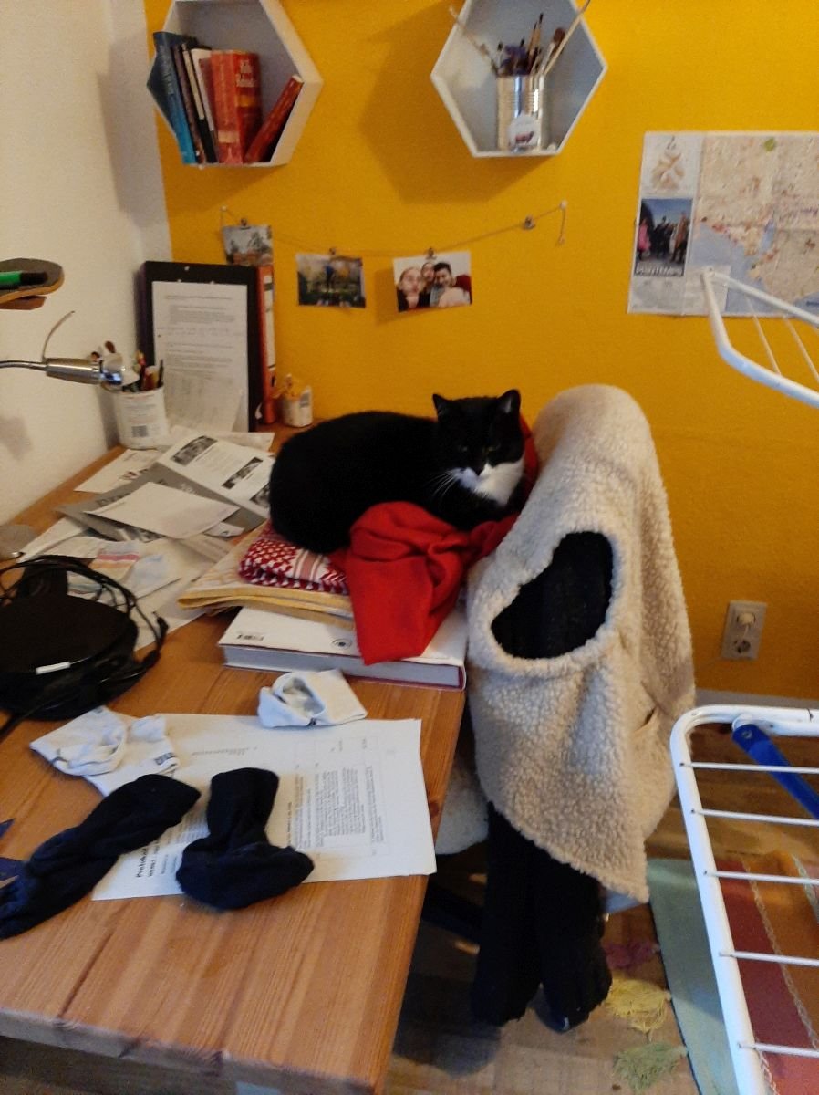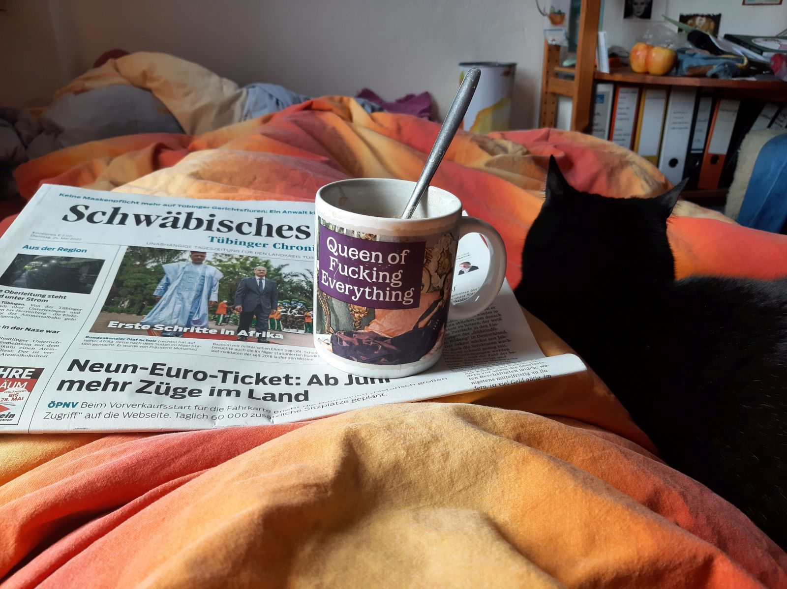 Also fahre ich erst mal nirgendwo hin, sondern entwickle stattdessen am nächsten Tag ein paar milde Erkältungssymptome und langweile mich mit meinem Omikrönchen. Ich verbringe einen äußerst ereignisarmen Tag mit Zeitung, Kaffee, Kopfweh und LaFette auf dem Schesslo und kommuniziere mit meiner mitfühlenden Umwelt. Die Klinik verpasst mir einen neuen Termin gute zwei Wochen später, immerhin. Lotti, die derzeit auf Klassenfahrt weilt, lässt mich per Messenger wissen, dass ich, sobald sie wieder zu Hause wäre, aber schön in meinem Zimmer zu bleiben und bei Klogängen Maske zu tragen habe. Man bekommt so viel zurück.